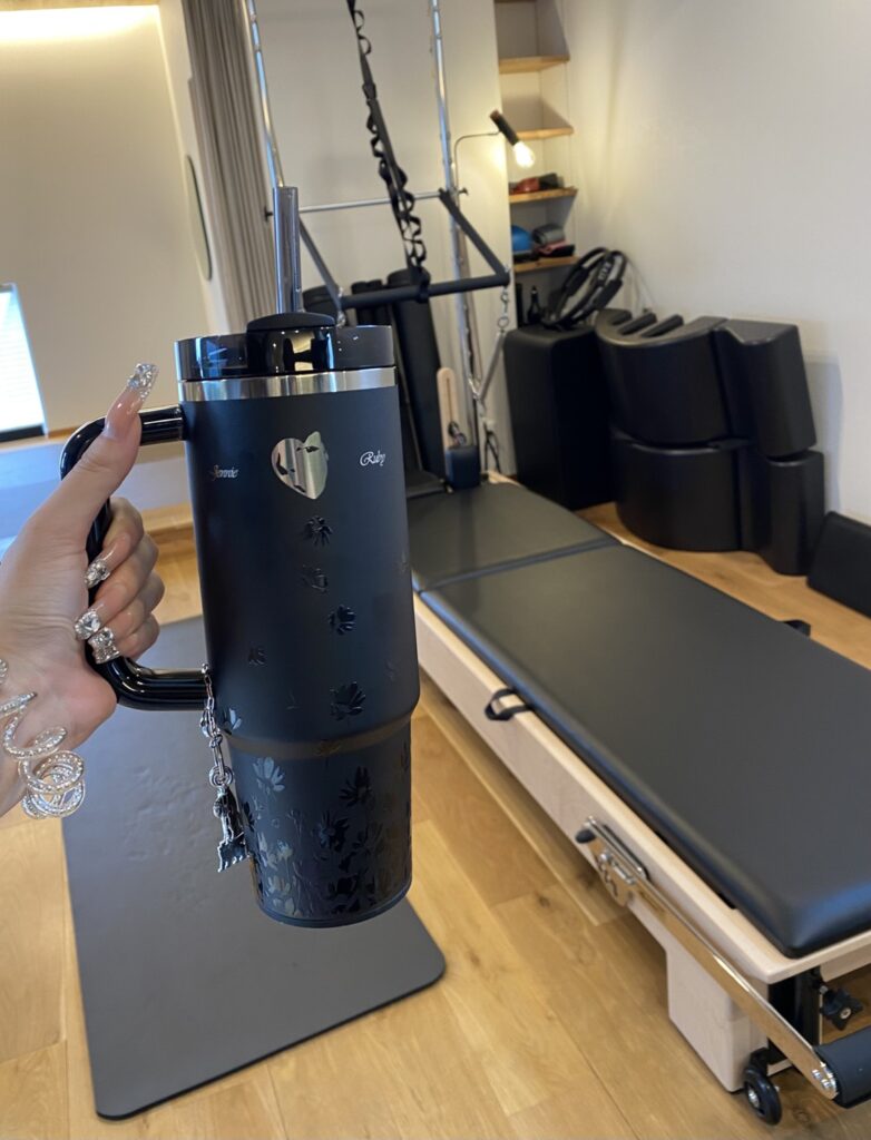 ↑お気に入りのタンブラーや推しのグッズと一緒にレッスンする様子♪