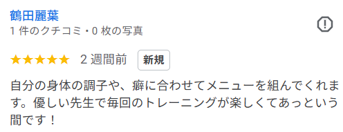 自分の身体の調子や、癖に合わせてメニューを組んでくれます。優しい先生で毎回のトレーニングが楽しくてあっという間です!