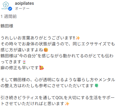 引き続きピラティスを通してQOLを大切にする生活をサポートさせていただければと思います✨